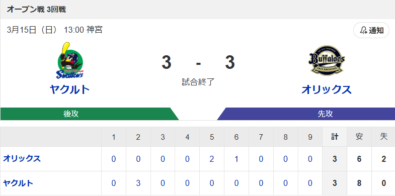 【試合結果】ヤクルト3-3オリックス 高梨5回途中1失点 橋本&岩田タイムリー